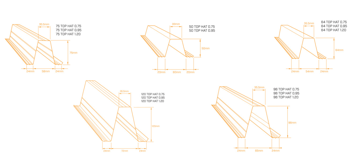 Top hats are available in different depths and thicknesses depending on the supplier and application. Common search terms include 64mm top hat, 96mm top hat and 120mm top hat. These sizes should not be treated as interchangeable: a deeper or thicker top hat can provide different spanning capacity, stiffness and installation behavior.
